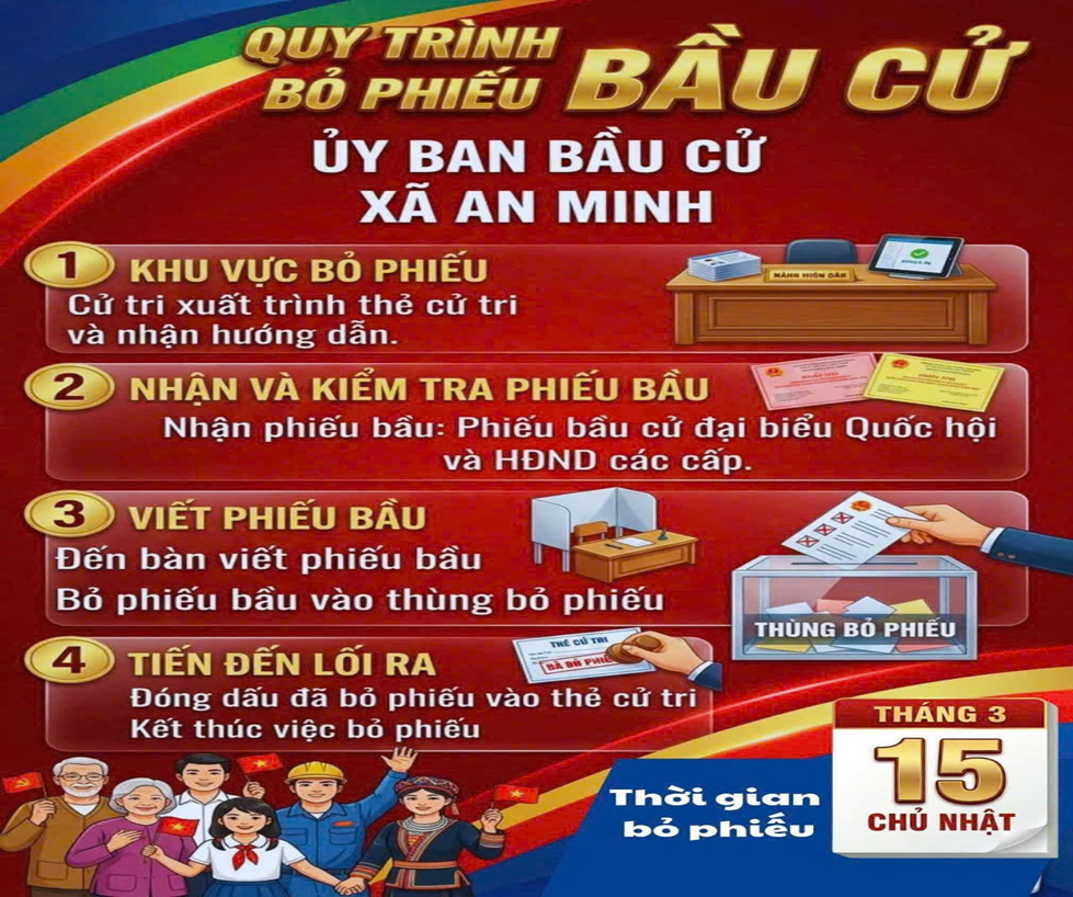 Thời gian tới, xã An Minh tiếp tục rà soát danh sách cử tri, tăng cường công tác tuyên truyền, trang trí các khu vực bỏ phiếu và thông báo rộng rãi ngày bầu cử, địa điểm và thời gian bỏ phiếu để cử tri chủ động tham gia. Với sự chuẩn bị tích cực, đồng bộ của cả hệ thống chính trị, xã An Minh đang sẵn sàng cho ngày hội lớn của toàn dân, góp phần tổ chức thành công cuộc bầu cử đại biểu Quốc hội khóa XVI và đại biểu Hội đồng nhân dân các cấp nhiệm kỳ 2026 – 2031.