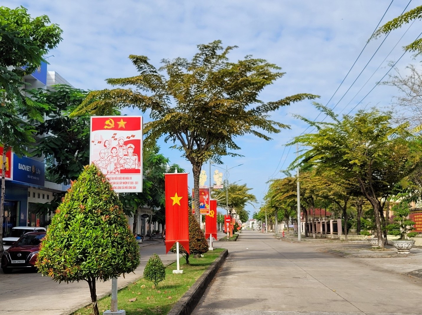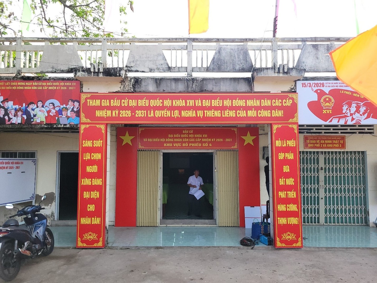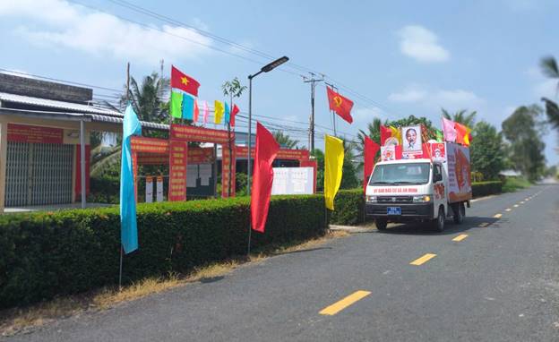 Hệ thống pano, áp phích, băng rôn, khẩu hiệu được lắp đặt tại các trục đường chính, khu vực trung tâm, trụ sở ấp và các khu vực bỏ phiếu. Nội dung khẩu hiệu ngắn gọn, dễ nhớ, thể hiện rõ ý nghĩa, tầm quan trọng của cuộc bầu cử và tinh thần trách nhiệm của công dân.