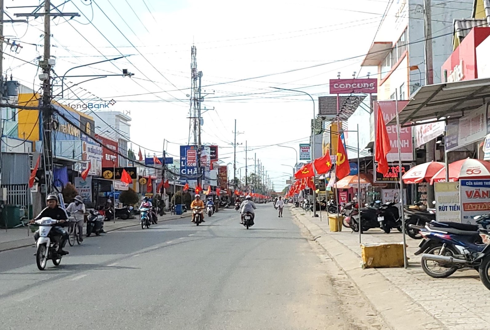 Trục đường chính trên địa bàn xã An Minh được trang trí với sắc đỏ của cờ tổ quốc